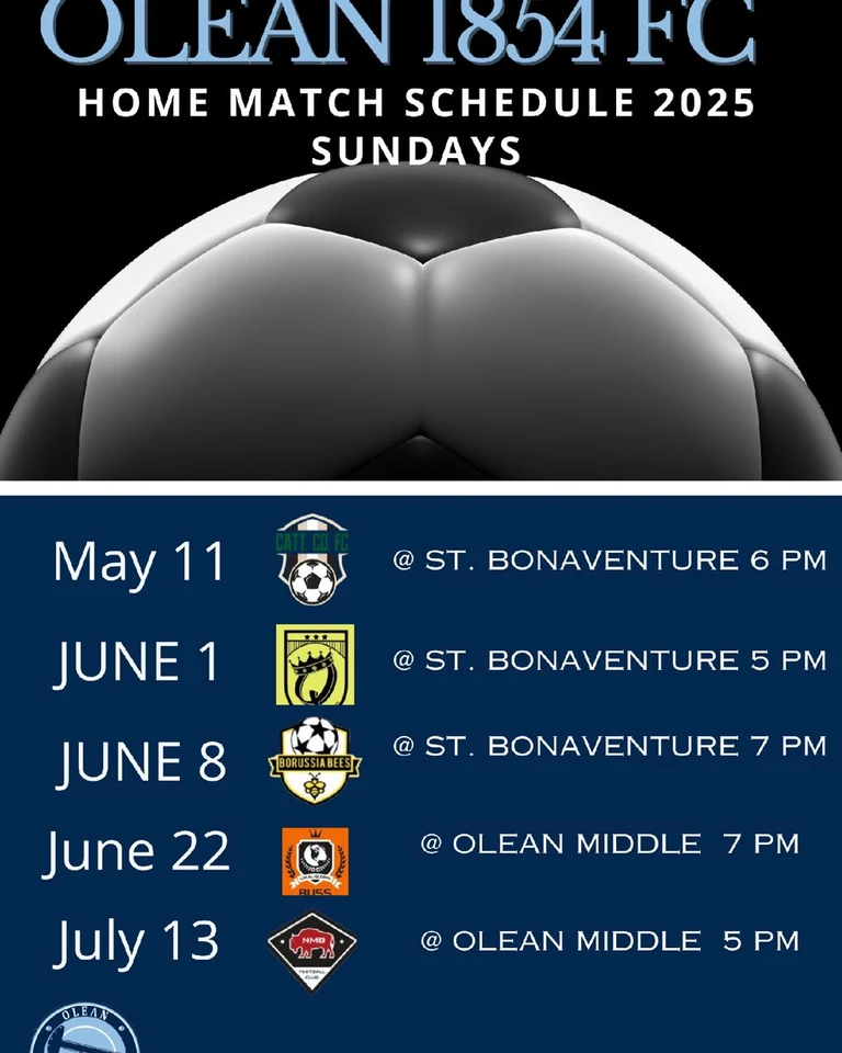 Olean 1854 is one of two amateur mens soccer teams in Cattaraugus County. Their home games are played at St. Bonaventure University or Olean Intermediate Middle School. The have the following home matches scheduled for 2025: