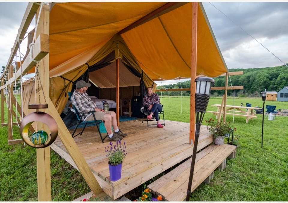 There's two 12 x 14 Safari Tent sites with 8ft covered porches and one 9 x 16 Cabin from Timberhut Cabin Company with a detached canopy and outside sitting area. Each site has plenty of space, so instead of looking directly at your neighbor, you have a view of the surrounding hills and wetlands.