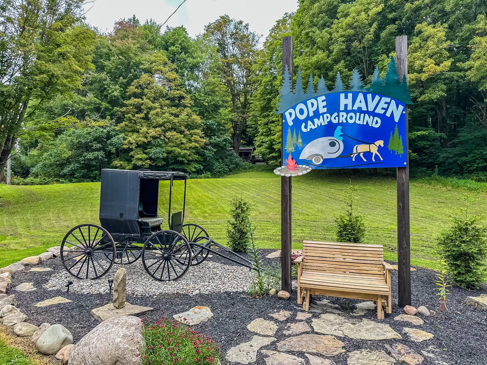 Pope Haven campground is a beautiful country side campground in the heart of the Amish trail. For people of all ages, family oriented and pet friendly. Cabin rental, golf cart rental, full hook up campsites or just tent camping available!